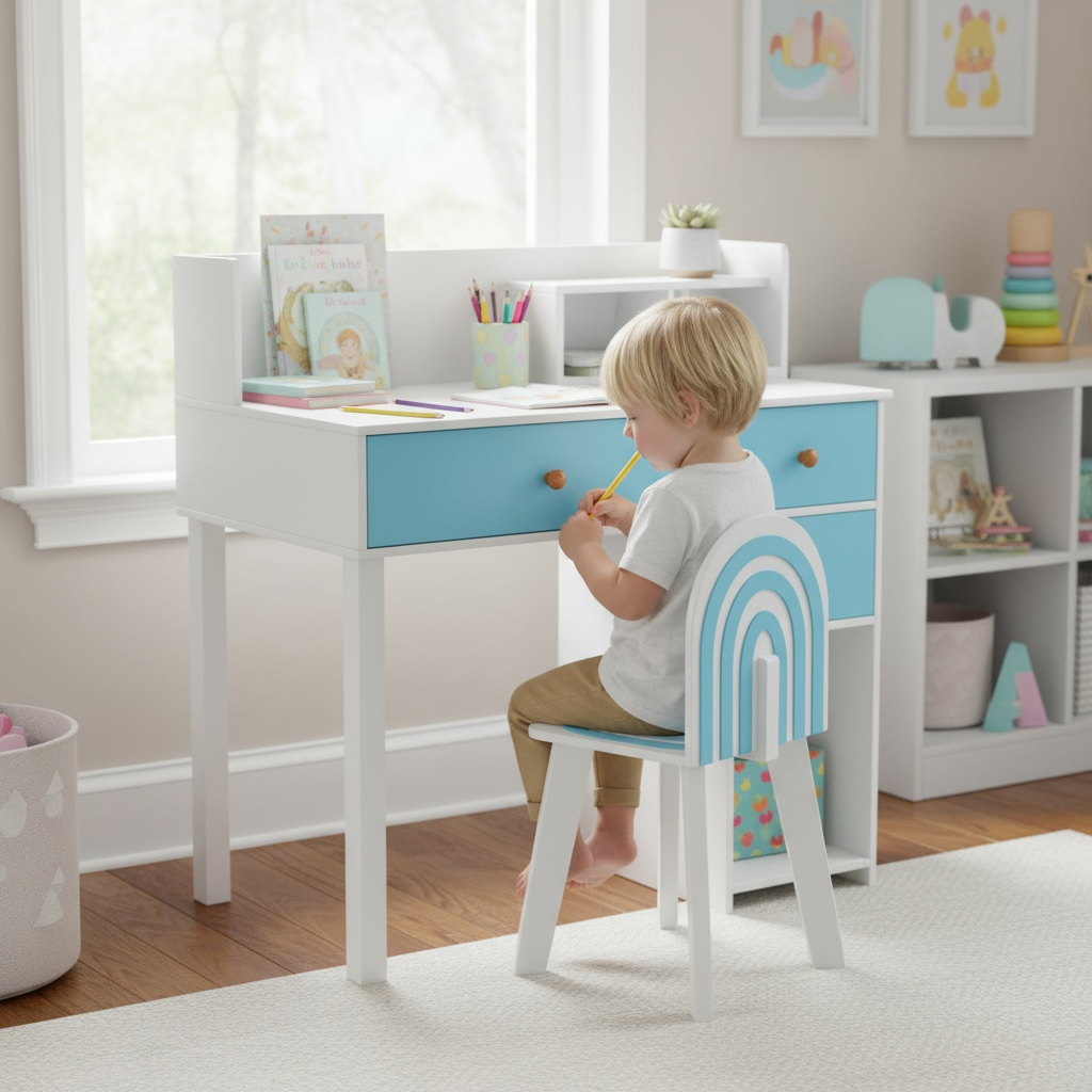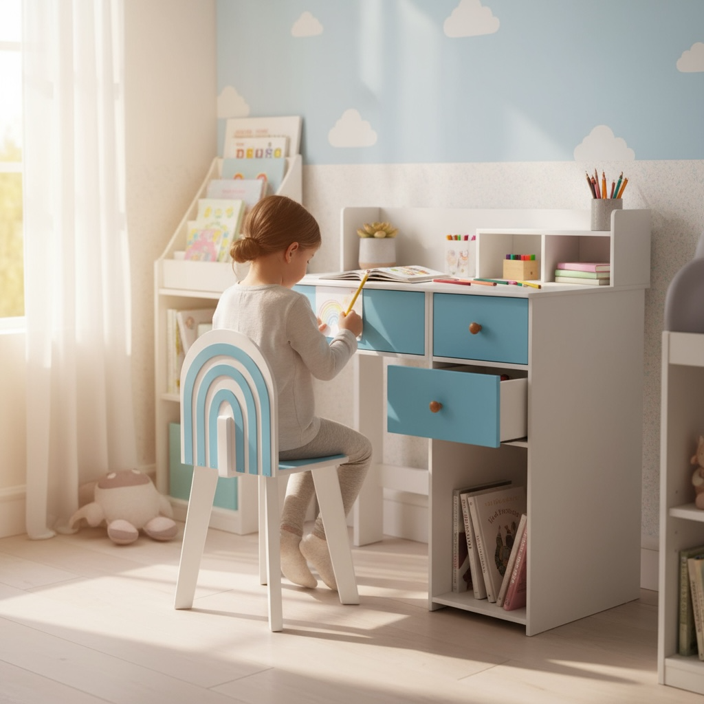 Diseñado para acompañar a niñas y niños en su crecimiento, este escritorio infantil es perfecto para estudiar, dibujar o dejar volar la imaginación. Su diseño compacto y funcional lo hace ideal para habitaciones pequeñas y grandes.