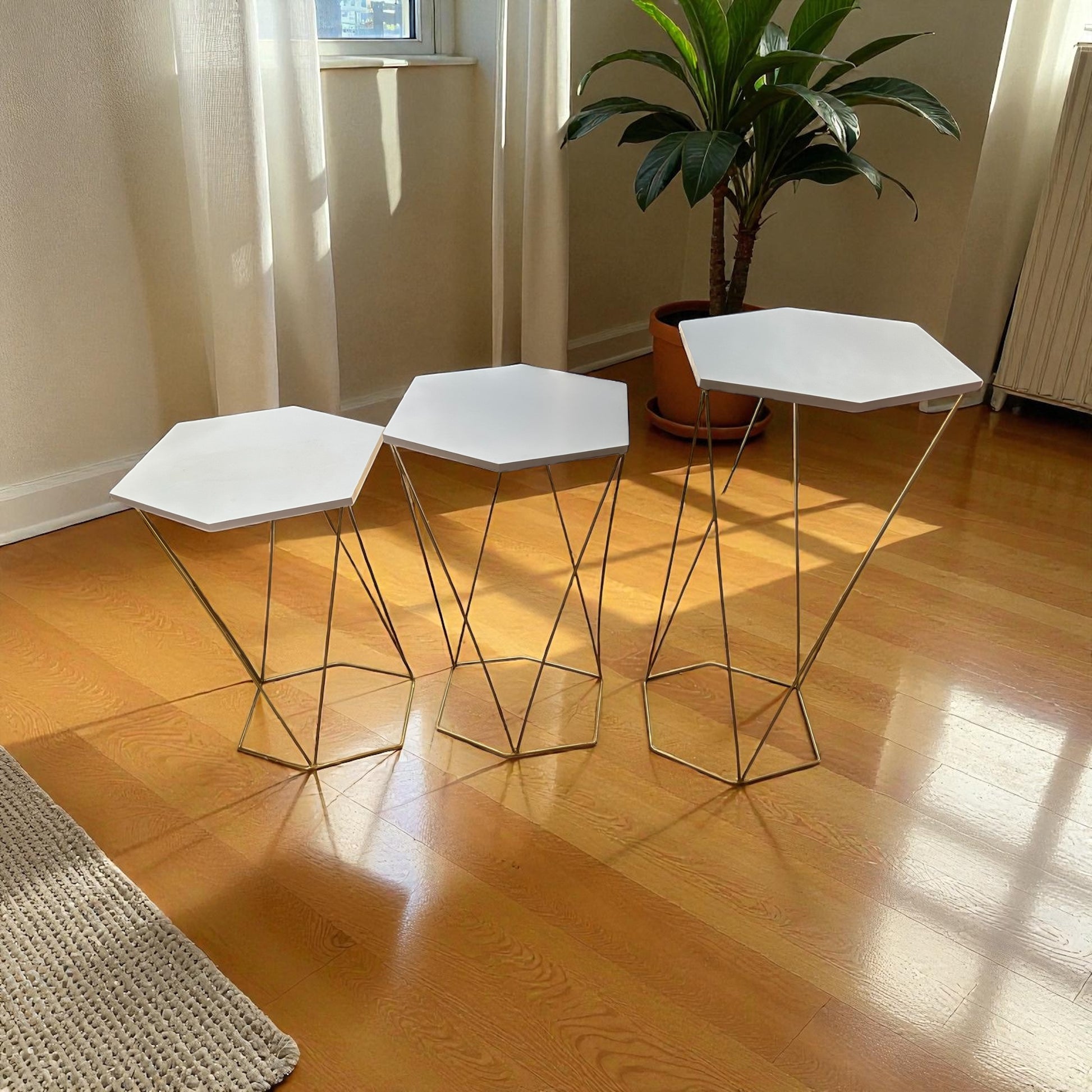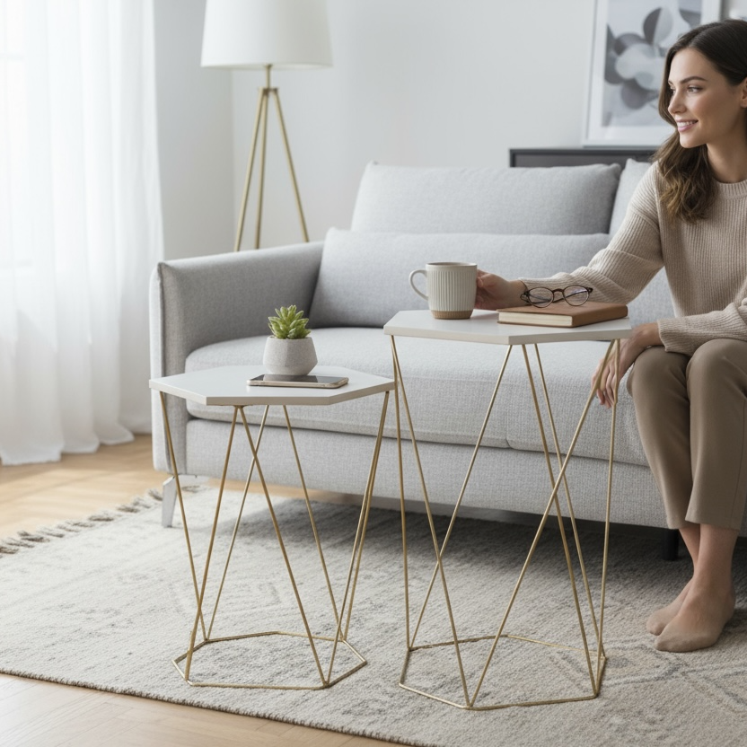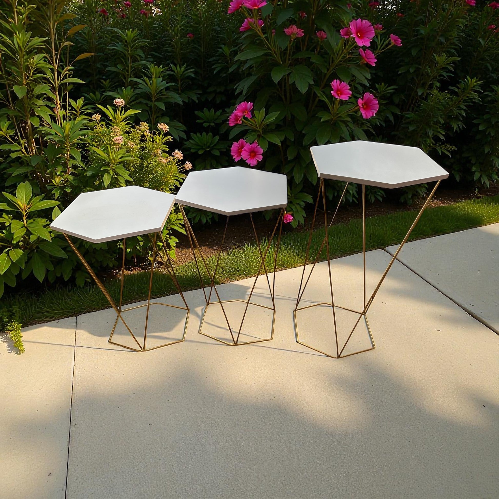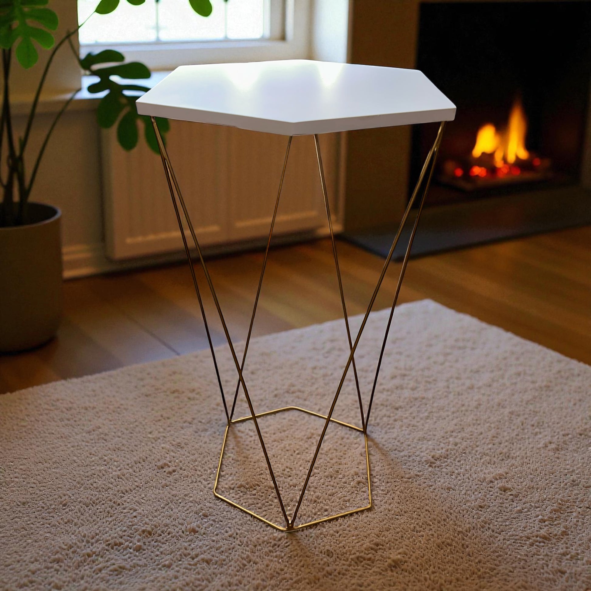 Las Mesas Decorativas Hexagonales combinan un diseño moderno con un estilo geométrico elegante. Su base metálica dorada aporta ligereza visual y estabilidad, mientras que la superficie hexagonal añade un toque distintivo y sofisticado. ✨