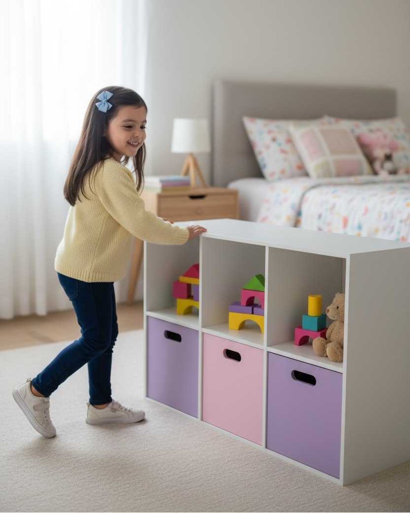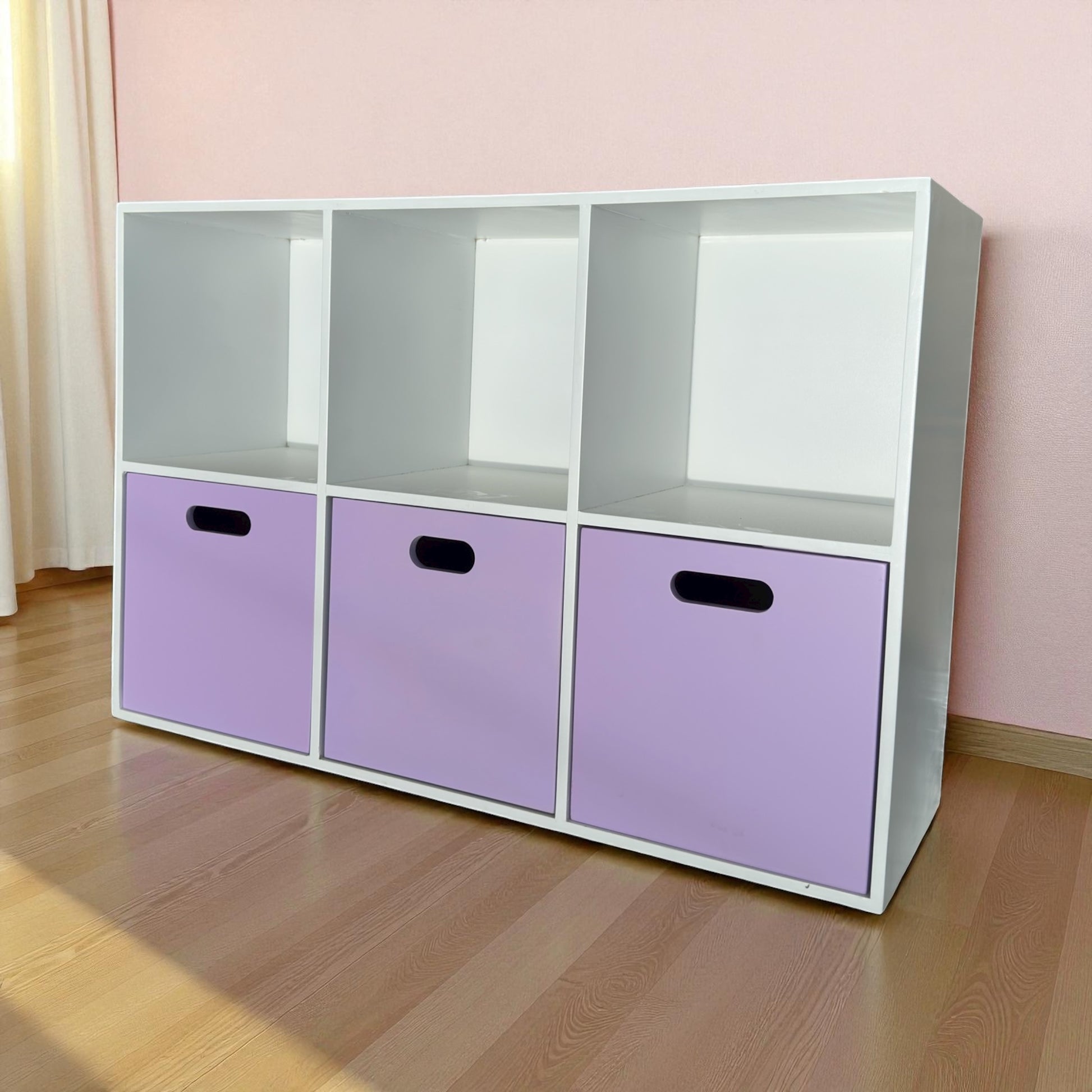 Práctico mueble de almacenamiento fabricado en MDF, con tres amplios compartimentos y cajones frontales en tonos pastel 🎨. Su diseño moderno y limpio se adapta fácilmente a cualquier ambiente, ideal para habitaciones infantiles, salas de juego o áreas de estudio 🧸.